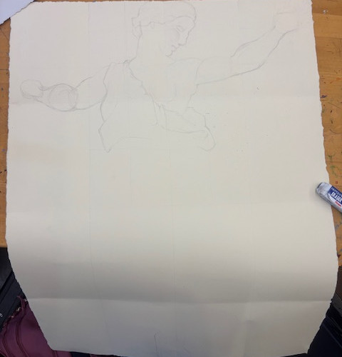These are images taken over the course of a few class periods and once after school. I started by drawing the grid lines, then the sketch, and now I am trying out my artist's marks. I'm still trying to learn how to hatch the way Raphael does, and it's a little tricky since I'm using pencil but the piece I am copying was done in pen and ink. I am also learning how much to space my hatch mark so it looks like the piece I'm copying.