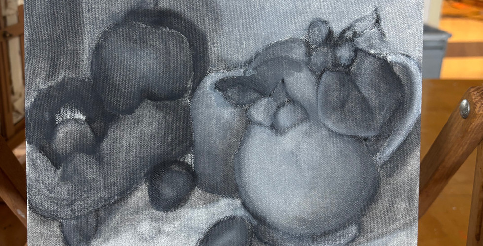 So far, I have started painting my grisaille. I have mostly just been making it more detailed and defining forms. I have also been working on getting my values right and shadows. My plan is to get more and more detailed and work some more on the background values. I'm feeling satisfied because I feel like I'm seeing progress and I'm enjoying using and mixing oil paints. I'm excited for the next steps of this painting!